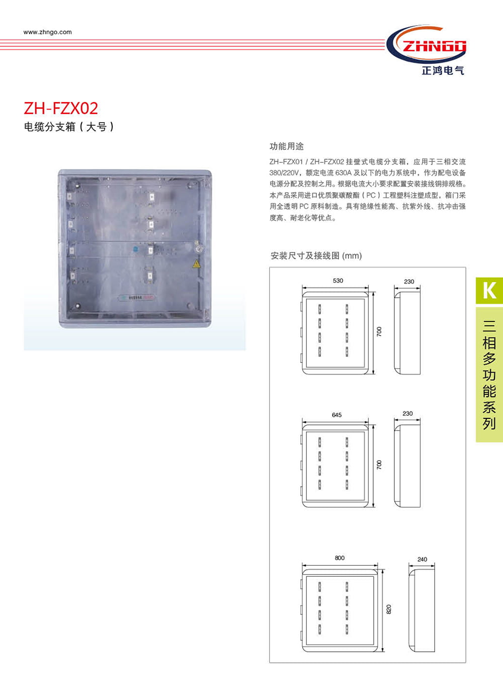 ZH-FZX01 / ZH-FZX02 掛壁式電纜分支箱,應(yīng)用于三相交流380/220V,額定電流 630A 及以下的電力系統(tǒng)中,作為配電設(shè)備電源分配及控制之用。根據(jù)電流大小要求配置安裝接線銅排規(guī)格。本產(chǎn)品采用進(jìn)口優(yōu)質(zhì)聚碳酸酯(PC)工程塑料注塑成型,箱門采用全透明 PC 原料制造。具有絕緣性能高、抗紫外線、抗沖擊強(qiáng)度高、耐老化等優(yōu)點(diǎn)。